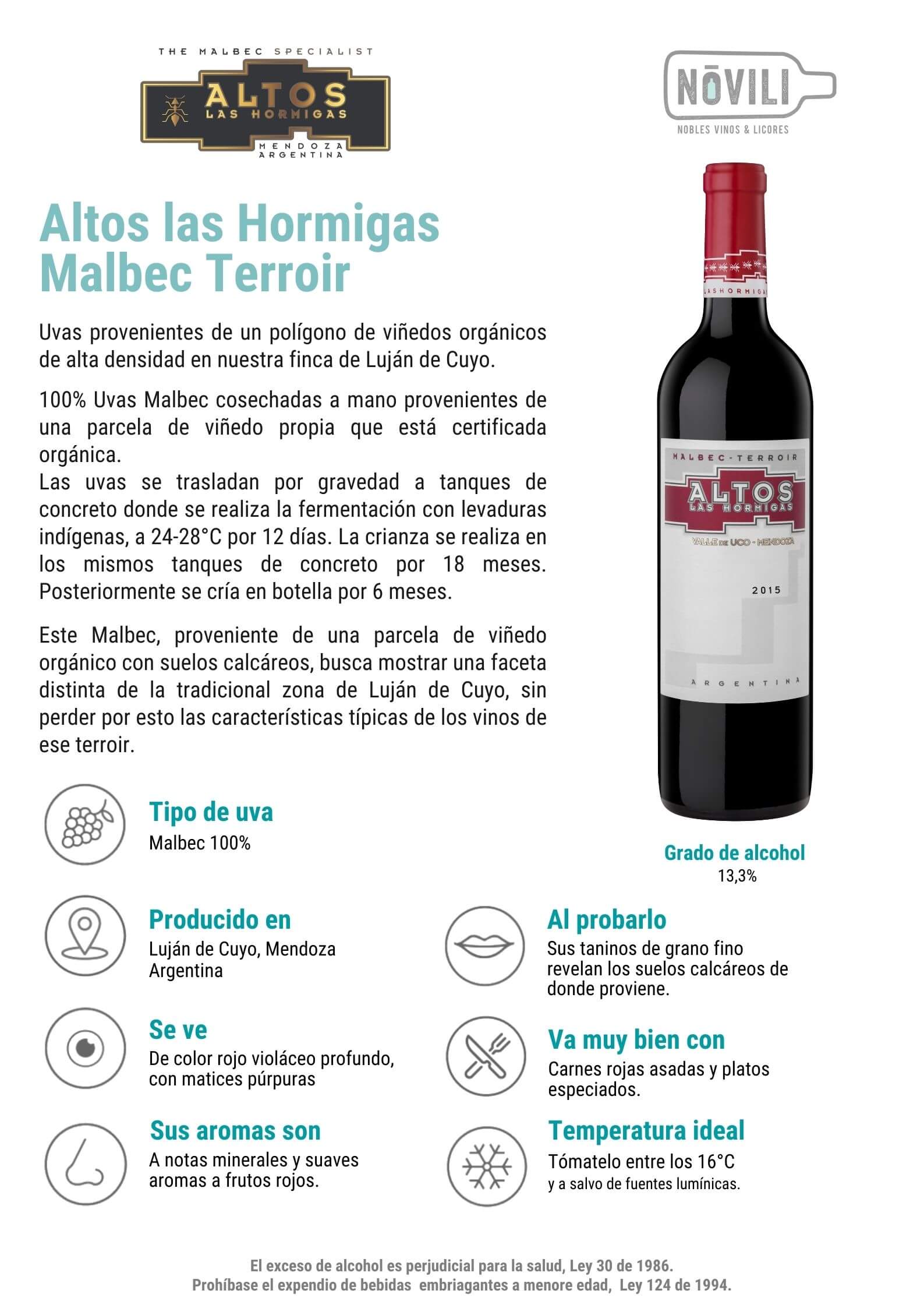 - Temperatura ideal: la temperatura ideal para disfrutar tu Alto Las Hormigas Malbec Terroir está entre los 16 y 18 °C. Idealmente, déjalo decantar durante una hora antes de beberlo.