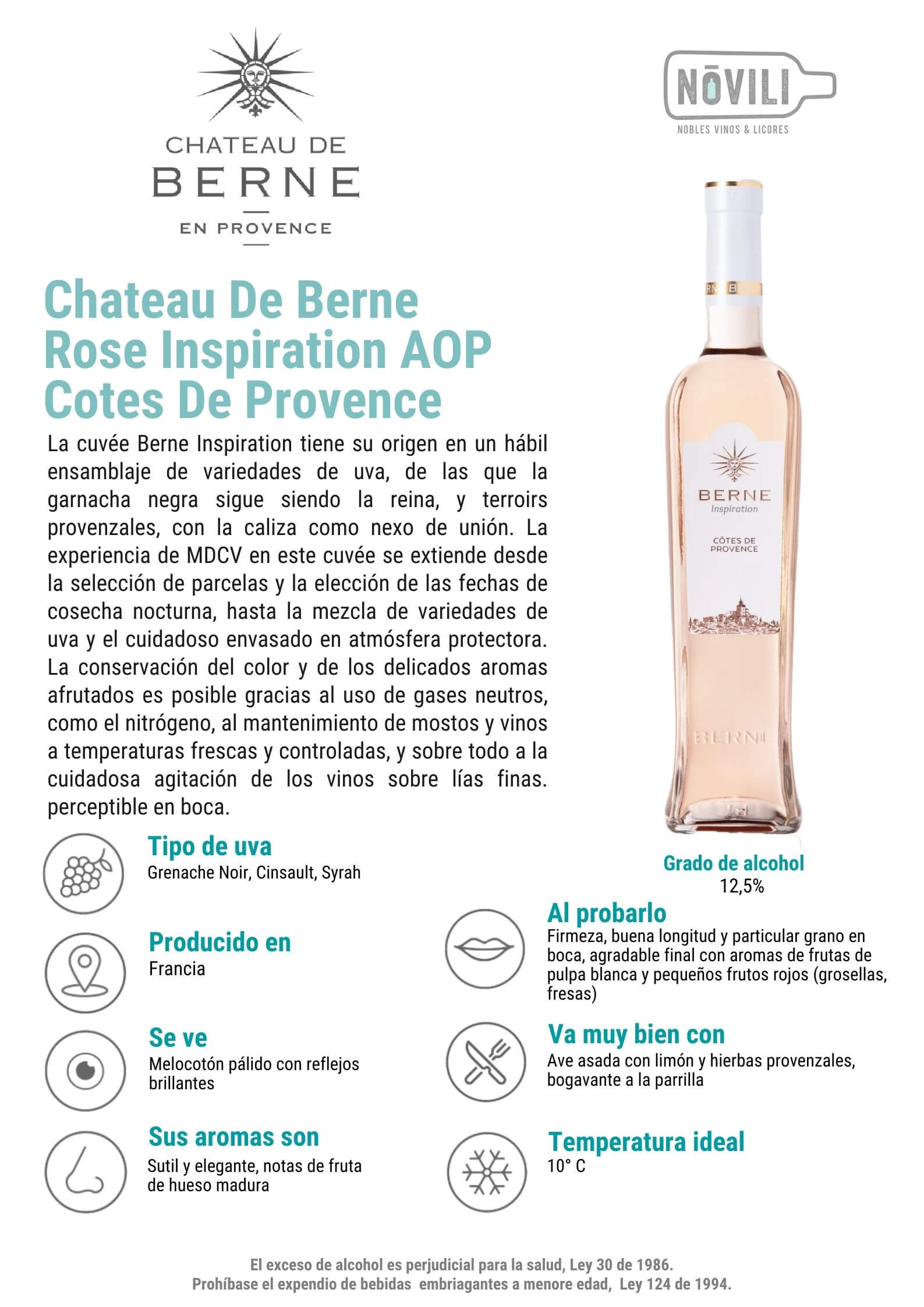 La cuvée Berne Inspiration tiene su origen en un hábil ensamblaje de variedades de uva, de las que la garnacha negra sigue siendo la reina, y terroirs provenzales, con la caliza como nexo de unión. La experiencia de MDCV en este cuvée se extiende desde la selección de parcelas y la elección de las fechas de cosecha nocturna, hasta la mezcla de variedades de uva y el cuidadoso envasado en atmósfera protectora. La conservación del color y de los delicados aromas afrutados es posible gracias al uso de gases neutros, como el nitrógeno, al mantenimiento de mostos y vinos a temperaturas frescas y controladas, y sobre todo a la cuidadosa agitación de los vinos sobre lías finas. perceptible en boca.