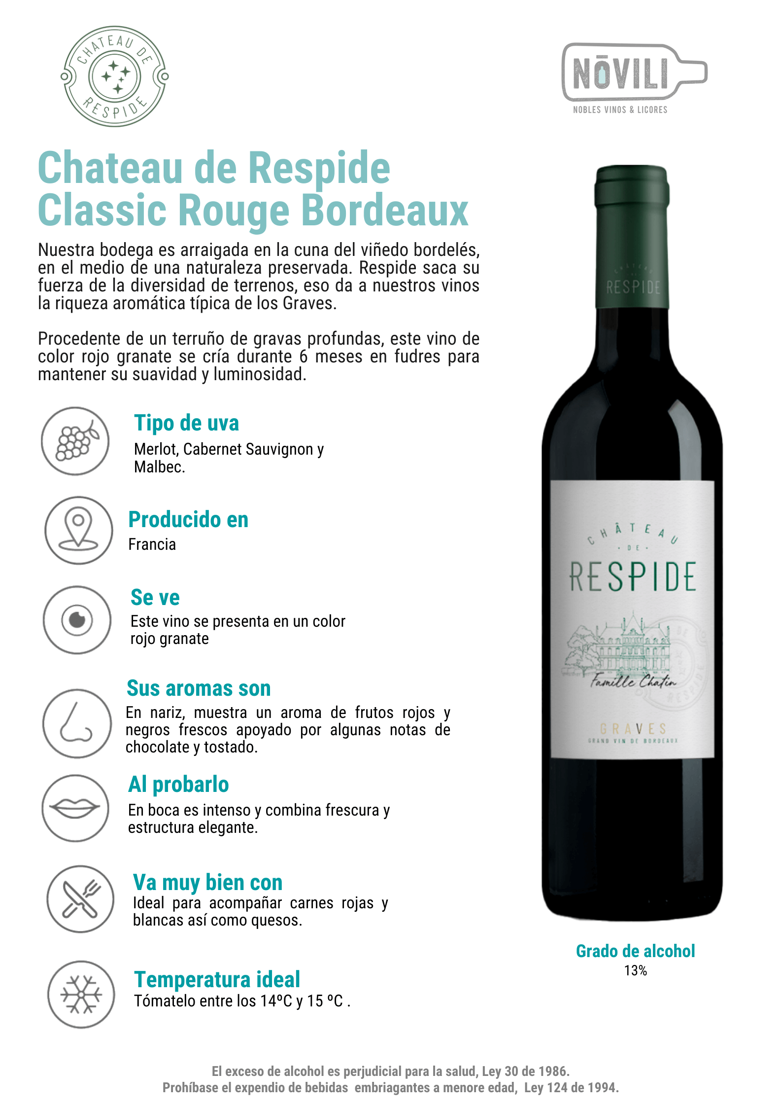- Tipo de copa: la copa Burdeos es ideal para servir tu Chateau de Respide Classic Roude Bourdeos