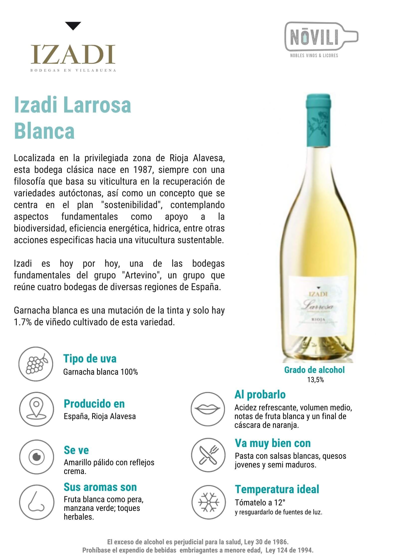 Localizada en la privilegiada zona de Rioja Alavesa, esta bodega clásica nace en 1987, siempre con una filosofía que basa su viticultura en la recuperación de variedades autóctonas, así como un concepto que se centra en el plan ‘”sostenibilidad”, contemplando aspectos fundamentales como apoyo a la biodiversidad, eficiencia energética, hídrica, entre otras acciones específicas hacia una viticultura sustentable. Izadi es hoy por hoy, una de las bodegas fundamentales del grupo “Artevino”, un grupo que reúne cuatro bodegas de diversas regiones de España. Garnacha blanca es una mutación de la tinta y solo hay 1.7% de viñedo cultivado de esta variedad.