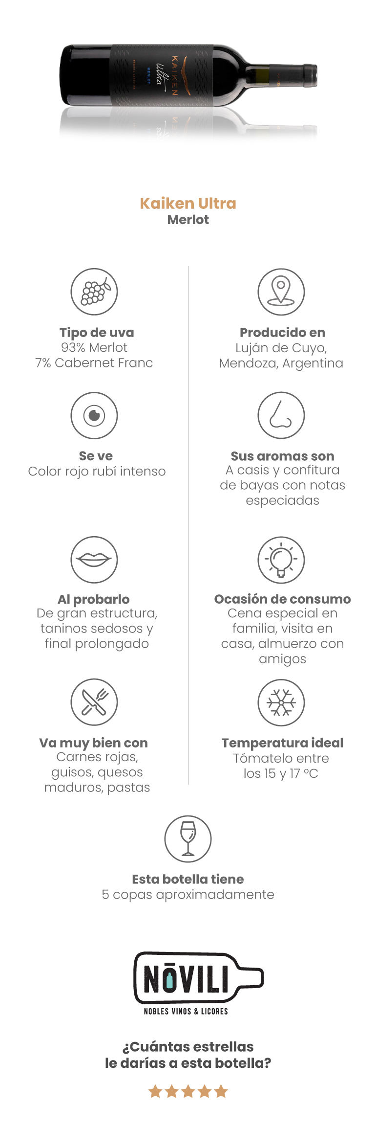 - Temperatura ideal: disfruta más tu botella de Kaiken Ultra Merlot a una temperatura entre los 15 y los 17°C