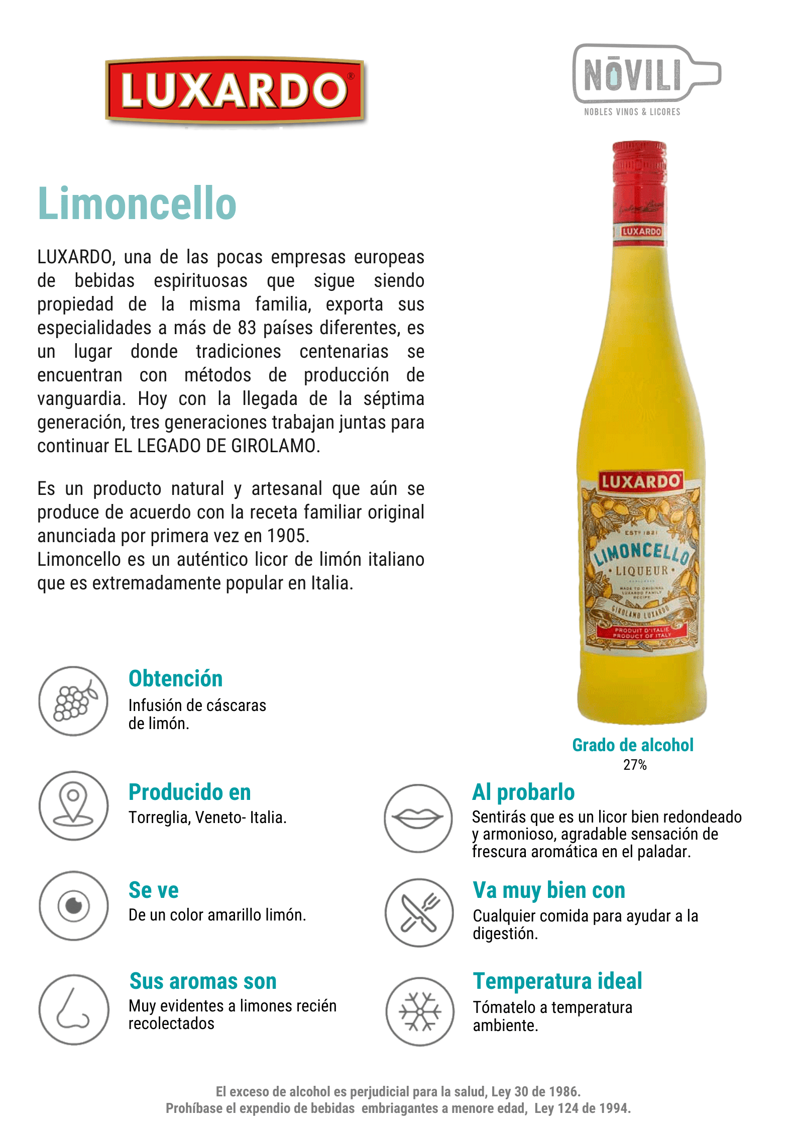 Ingredientes: es obtenida de la infusión de cáscaras de limón amarillo en alcohol, azúcar y agua, con una producción totalmente natural, libre de colorantes, aditivos y conservantes