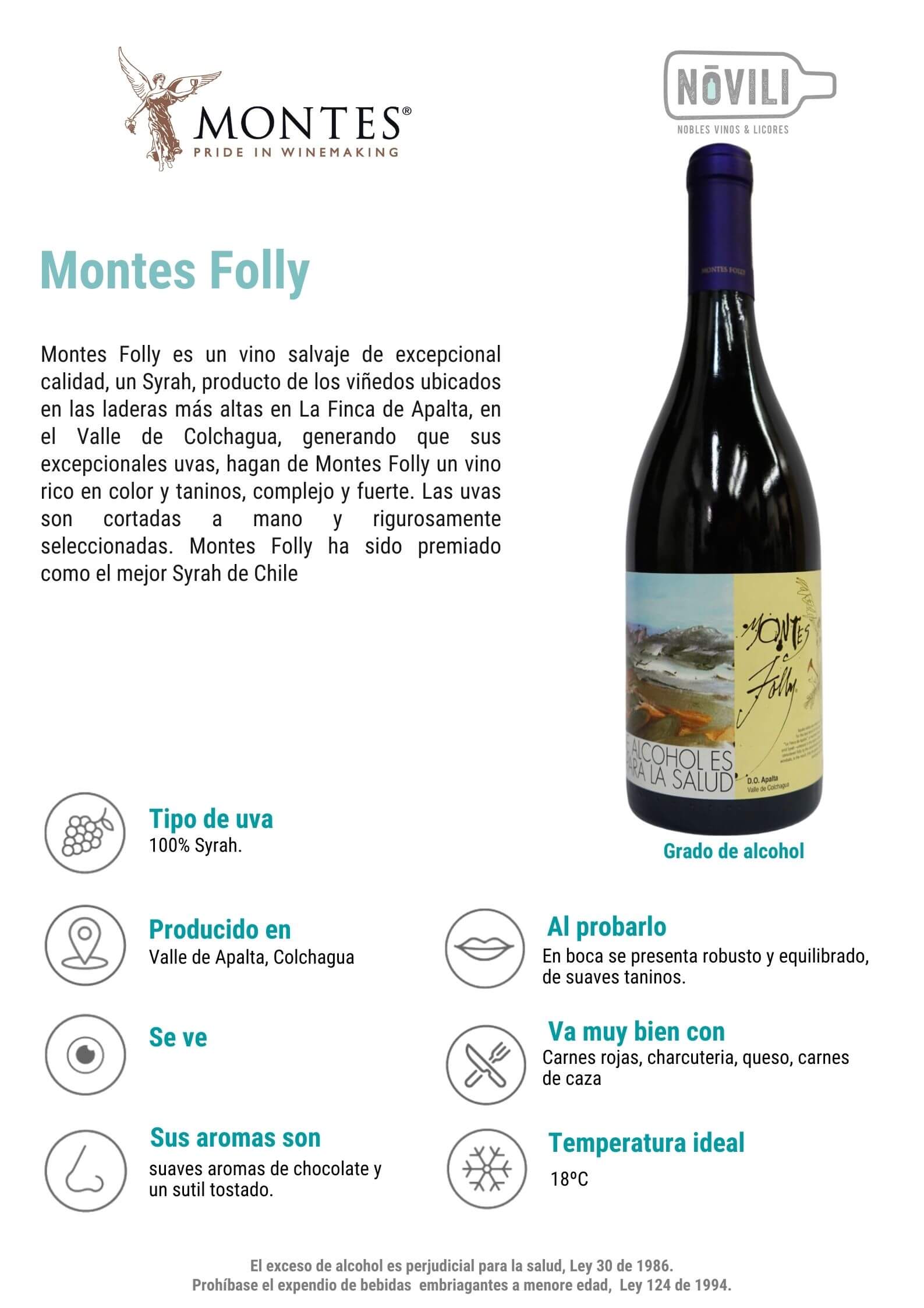 - Todo conquistador tiene mucho de aventurero y loco. Así fue como en este camino de conquista nació este Ultra Premium Chileno creado con la uva Syrah. Los invito a ser parte de esta loquísima aventura llamada Montes Folly. ¡Salud!