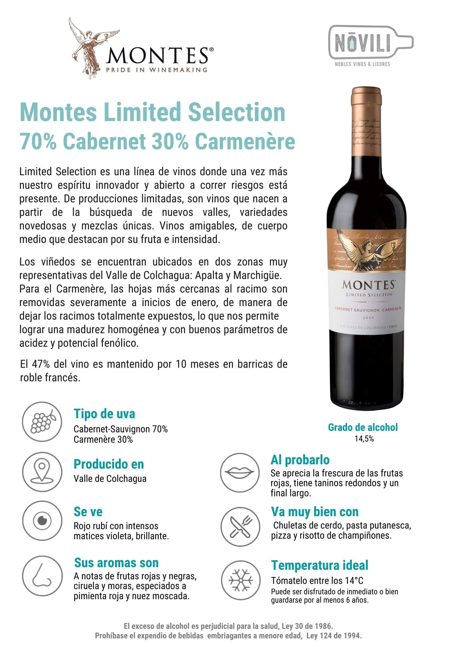 - Temperatura ideal: idealmente disfruta tu Montes Selección Limitada 70-30 a una temperatura entre los 17 y 19 °C. Déjalo decantar por media hora.