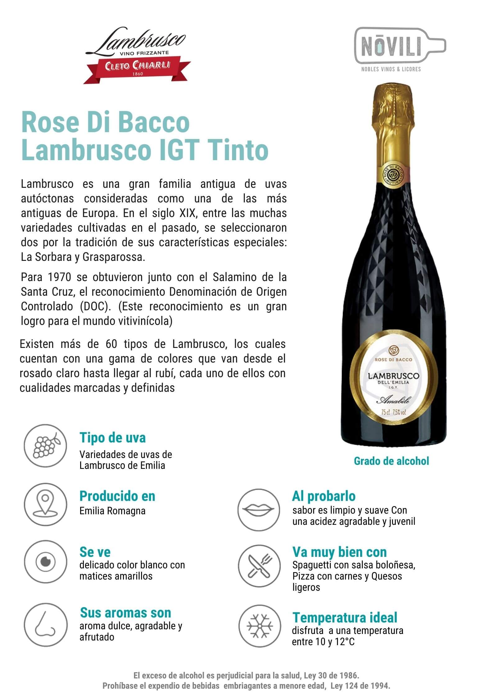 - Temperatura ideal: disfruta más tu Lambrusco Rose Di Bacco Tinto a una temperatura entre 10 y 12°C